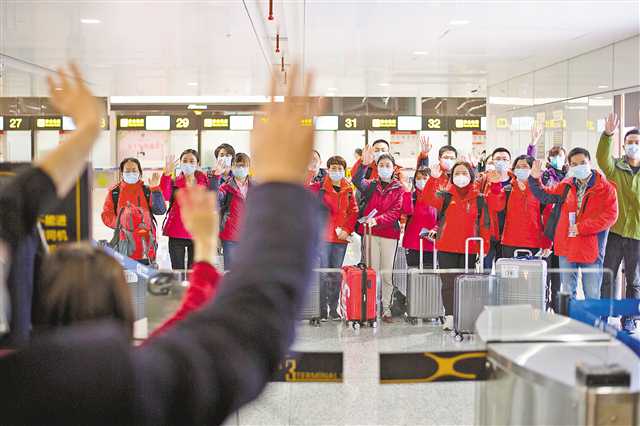 1月26日,重慶機(jī)場T3航站樓候機(jī)廳,重慶市市級醫(yī)療隊成員與親人、同事?lián)]手告別,他們將奔赴湖北孝感支援一線救治工作。記者 謝智強(qiáng) 攝