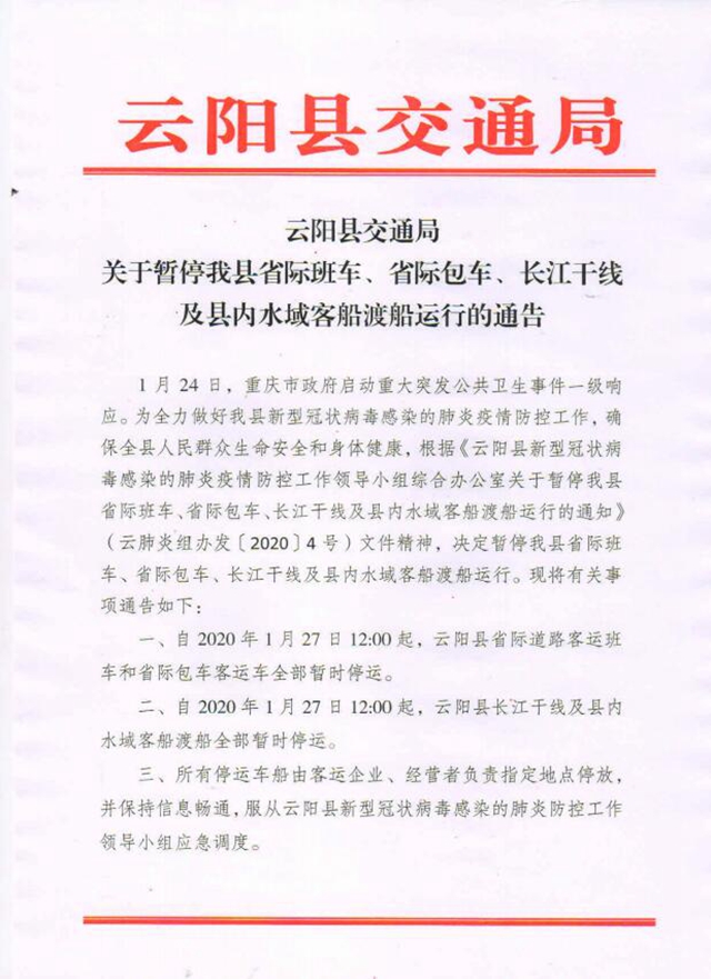 1月24日,重慶市政府啟動(dòng)重大突發(fā)公共衛(wèi)生事件一級(jí)響應(yīng)。為全力做好我縣新型冠狀病毒感染的肺炎疫情防控工作,確保全縣人民群眾生命安全和身體健康,根據(jù)《云陽(yáng)縣新型冠狀病毒感染的肺炎疫情防控工作領(lǐng)導(dǎo)小組綜合辦公室關(guān)于暫停我縣省際班車(chē)、省際包車(chē)、長(zhǎng)江干線及縣內(nèi)水域客船渡船運(yùn)行的通知》(云肺炎組辦發(fā)〔2020〕4號(hào))文件精神,決定暫停我縣省際班車(chē)、省際包車(chē)、長(zhǎng)江干線及縣內(nèi)水域客船渡船運(yùn)行?,F(xiàn)將有關(guān)事項(xiàng)通告如下: