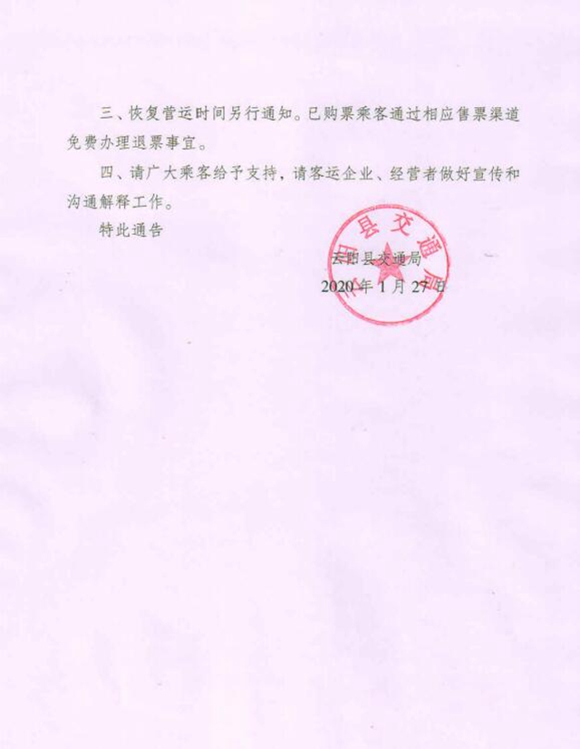 一、自2020年1月27日12:00起,云陽(yáng)縣省際道路客運(yùn)班車(chē)和省際包車(chē)客運(yùn)車(chē)全部暫時(shí)停運(yùn)。