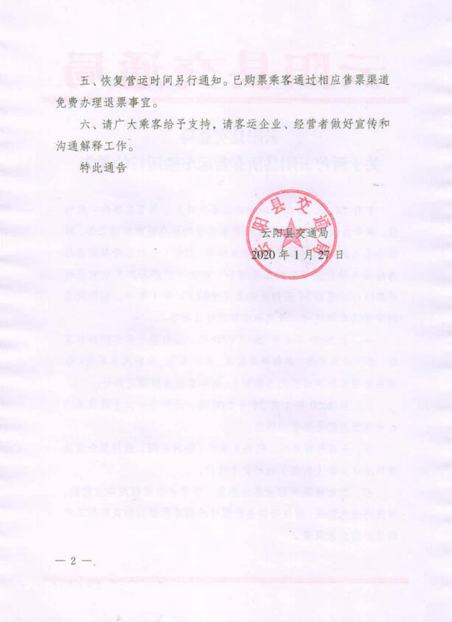 一、自2020年1月28日0:00起,云陽(yáng)縣所有省際班車客運(yùn)、縣際班車客運(yùn)、縣內(nèi)班車客運(yùn)、公交客運(yùn)、出租汽車客運(yùn)(含巡游出租車和網(wǎng)絡(luò)預(yù)約出租車)、包車客運(yùn)全部暫時(shí)停運(yùn)。
