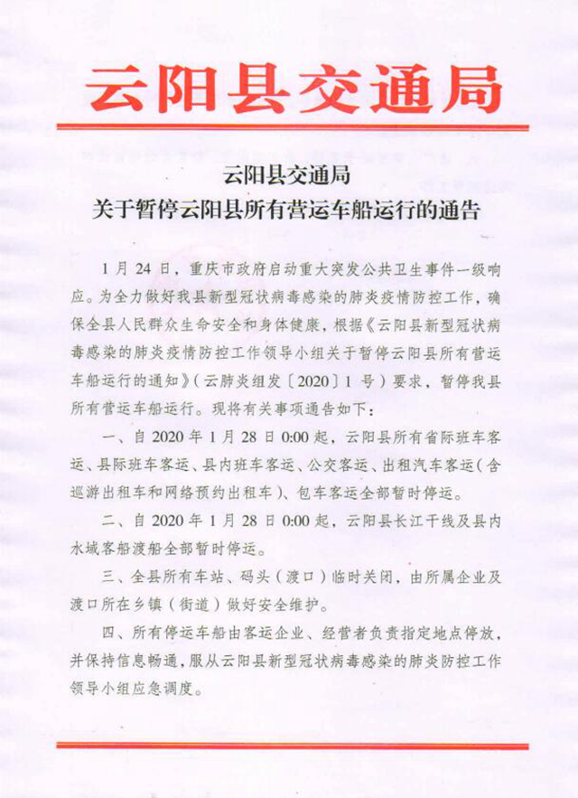 1月24日,重慶市政府啟動(dòng)重大突發(fā)公共衛(wèi)生事件一級(jí)響應(yīng)。為全力做好我縣新型冠狀病毒感染的肺炎疫情防控工作,確保全縣人民群眾生命安全和身體健康,根據(jù)《云陽(yáng)縣新型冠狀病毒感染的肺炎疫情防控工作領(lǐng)導(dǎo)小組關(guān)于暫停云陽(yáng)縣所有營(yíng)運(yùn)車船運(yùn)行的通知》(云肺炎組發(fā)〔2020〕1號(hào))要求,暫停我縣所有營(yíng)運(yùn)車船運(yùn)行。現(xiàn)將有關(guān)事項(xiàng)通告如下: