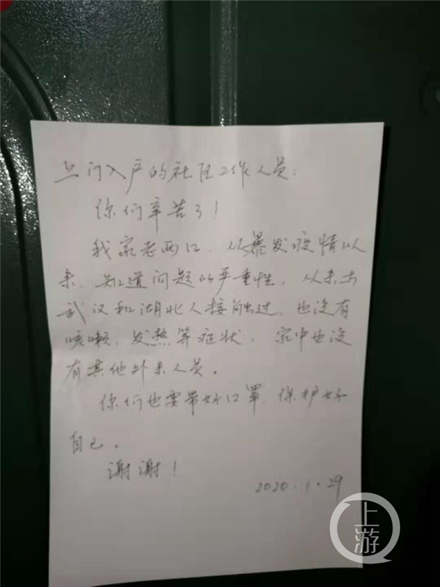 瞬間一:渝中區(qū)朝天門街道白象街社區(qū)老兩口在門上給排查人員寫了一封信:“你們要好好保護自己!”