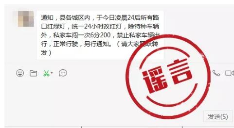 31日,有網(wǎng)友在微信群流傳一則通知:“巫溪縣各城區(qū)內(nèi),于今日凌晨24后所有路口紅綠燈,統(tǒng)一24小時(shí)改紅燈,除特種車輛外,私家車闖一次6分200,禁止私家車輛出行,正常行駛,另行通知?!苯?jīng)巫溪縣委網(wǎng)信辦核實(shí),此消息系謠言。據(jù)悉,此類謠言在河南等地也有傳播,請(qǐng)大家不信謠、不傳謠,提高警惕和信息辨識(shí)能力。