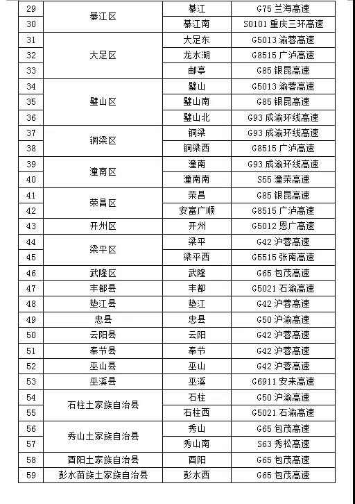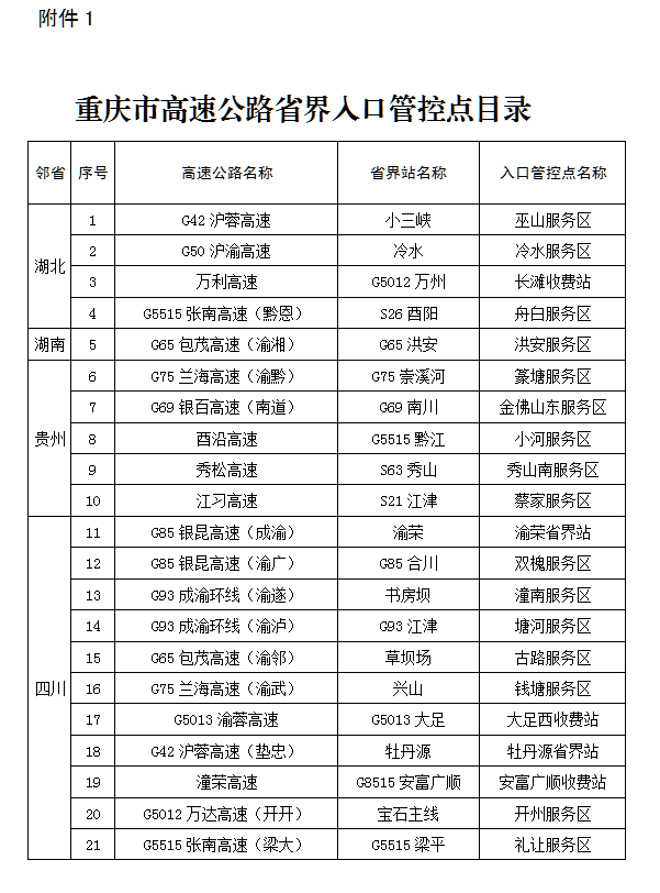 附:重慶市高速公路省界入口管控點目錄