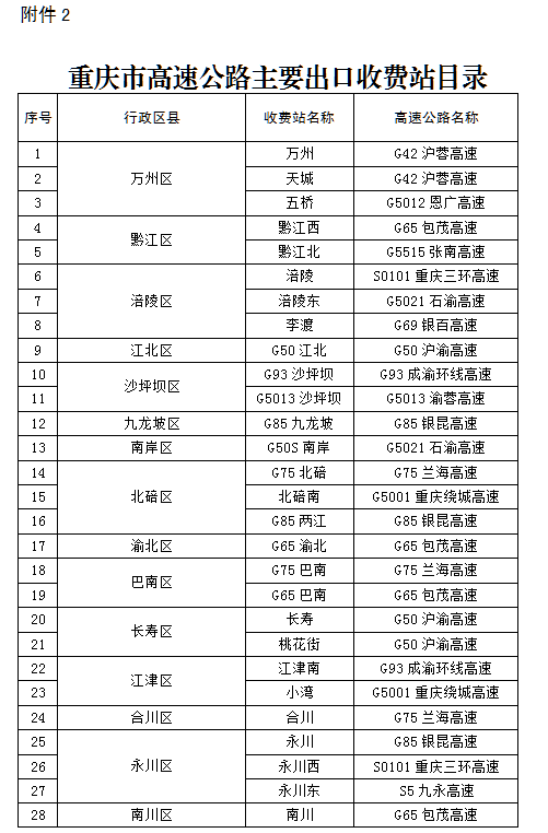 2. 重慶市高速公路主要出口收費站目錄