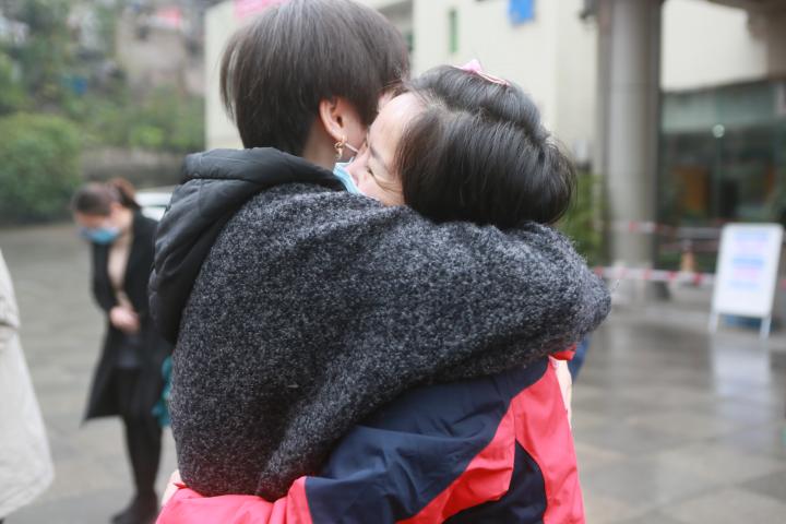 綦江區(qū)人民醫(yī)院前的廣場上,即將出征的兒科護(hù)士文道會(huì)與朋友相擁道別。受訪醫(yī)院供圖 華龍網(wǎng)發(fā)