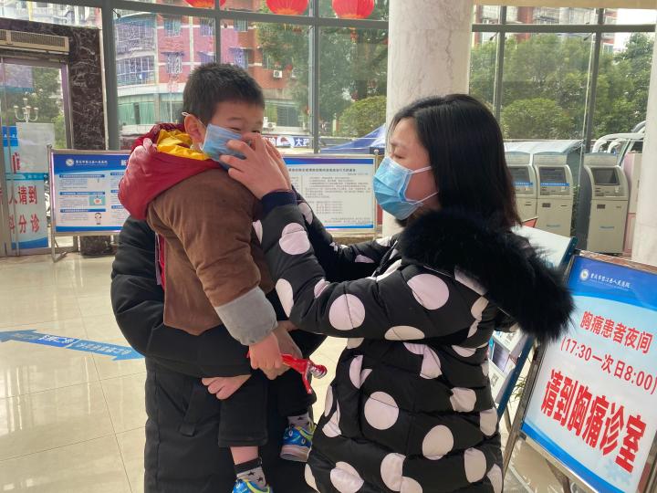 墊江縣人民醫(yī)院大廳里,即將出征的重癥醫(yī)學(xué)科江慢和她3歲孩子道別。 受訪醫(yī)院供圖 華龍網(wǎng)發(fā)