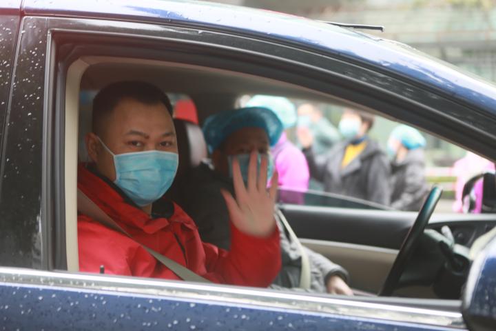 即將出發(fā)去機(jī)場,綦江區(qū)人民醫(yī)院的急診醫(yī)學(xué)科醫(yī)生鄧川向車窗外家人揮手道別。 受訪醫(yī)院供圖 華龍網(wǎng)發(fā)