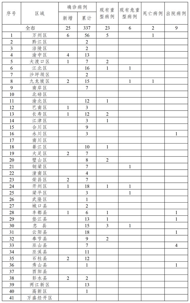 新增確診病例中,萬州區(qū)6例、渝中區(qū)4例、大渡口區(qū)1例、九龍坡區(qū)2例、巴南區(qū)1例、長壽區(qū)1例、大足區(qū)2例、榮昌區(qū)2例、開州區(qū)1例、豐都縣1例、石柱縣2例、彭水縣2例;新增出院病例為巫山縣1例。