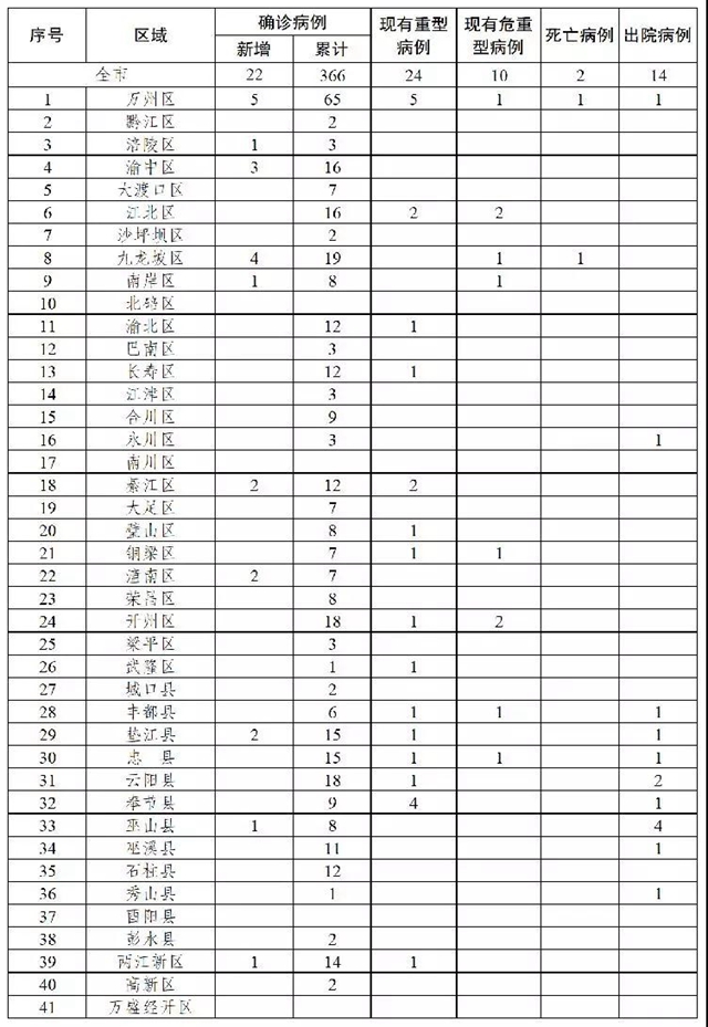 新增確診病例中,萬州區(qū)5例、涪陵區(qū)1例、渝中區(qū)3例、九龍坡區(qū)4例、南岸區(qū)1例、綦江區(qū)2例、潼南區(qū)2例、墊江縣2例、巫山縣1例、兩江新區(qū)1例。新增出院病例中,萬州區(qū)1例、忠縣1例、云陽縣1例、奉節(jié)縣1例、巫溪縣1例。