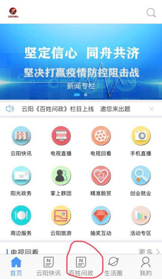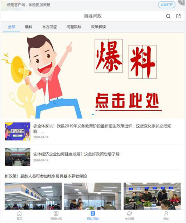 2、打開云陽手機臺,點擊首頁下方“百姓問政”,再點曝料,拍攝或填寫上傳即可。