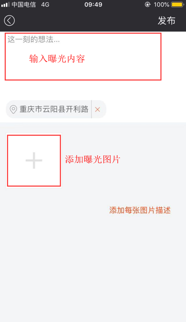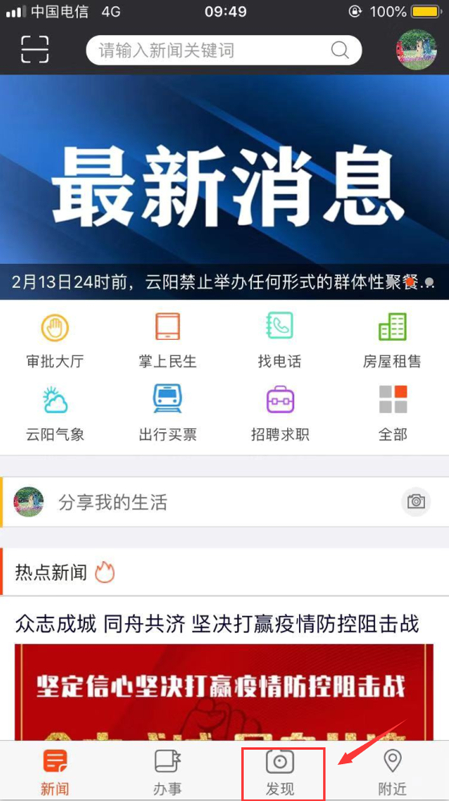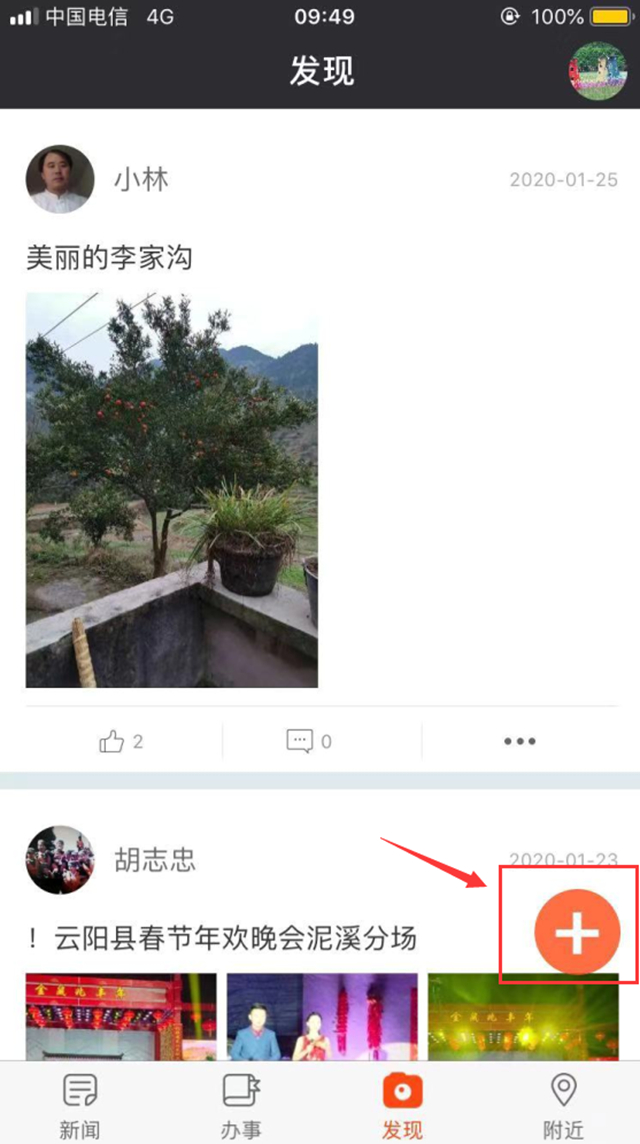 1、打開智慧云陽APP,點擊首頁下方“發(fā)現(xiàn)”,再點擊頁面右下方的“+”,進入拍攝或填寫上傳即可。