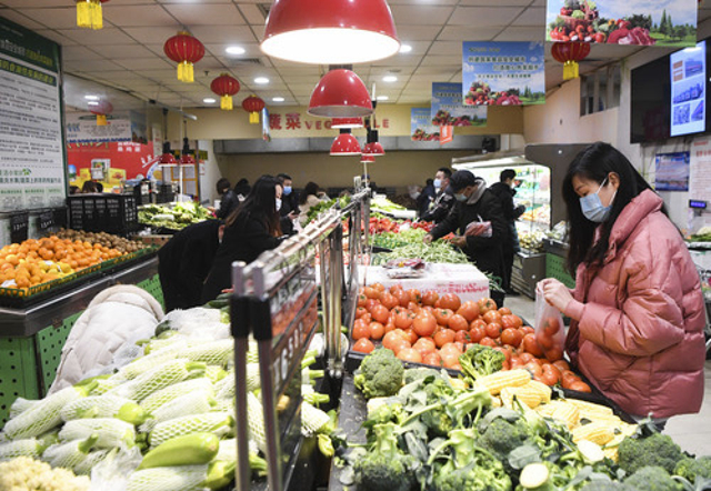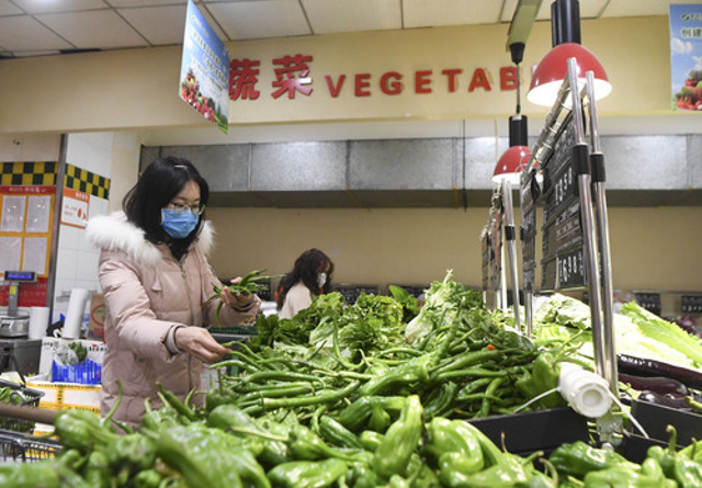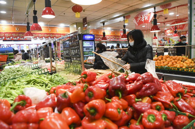 ↑2月5日,消費(fèi)者在重慶市云陽(yáng)縣雙江街道一家超市內(nèi)選購(gòu)蔬菜。新華社記者王全超攝