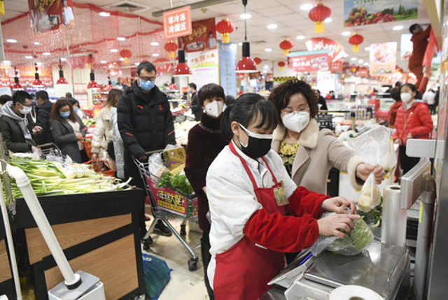 ↑2月5日,消費(fèi)者在重慶市云陽(yáng)縣雙江街道一家超市內(nèi)排隊(duì)稱(chēng)重。新華社記者王全超攝