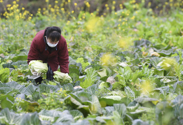 ↑2月5日,重慶市云陽(yáng)縣青龍街道馬沱村蔬菜基地工作人員在地里收獲蔬菜。新華社記者王全超攝