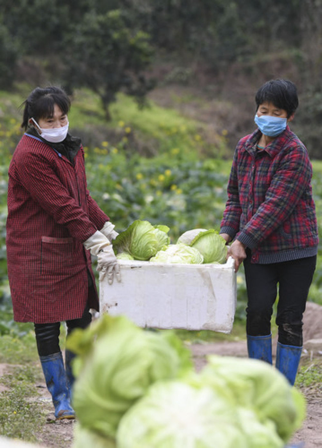 ↑2月5日,重慶市云陽(yáng)縣青龍街道馬沱村蔬菜基地工作人員在搬運(yùn)剛從地里收獲的蔬菜。新華社記者王全超攝