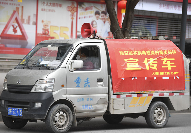 2月4日,通過車載廣播進(jìn)行疫情防控宣傳的車輛經(jīng)過重慶市云陽縣人和街道。 新華社記者王全超攝