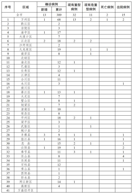 新增確診病例中,萬州區(qū)1例、渝中區(qū)1例、江北區(qū)2例、綦江區(qū)1例、潼南區(qū)3例、豐都縣3例、墊江縣1例、云陽縣1例;新增重型病例中,萬州區(qū)7例、忠縣1例、兩江新區(qū)1例;重型病例轉(zhuǎn)普通型病例中,綦江區(qū)1例、兩江新區(qū)1例;重型病例轉(zhuǎn)危重型病例中,武隆區(qū)1例、奉節(jié)縣1例;危重型病例轉(zhuǎn)重型病例為銅梁區(qū)1例;新增出院病例為萬州區(qū)1例。