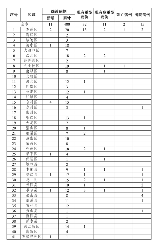新增確診病例中,萬州區(qū)2例、渝中區(qū)1例、合川區(qū)4例、梁平區(qū)1例、墊江縣1例、奉節(jié)縣1例、萬盛經(jīng)開區(qū)1例。