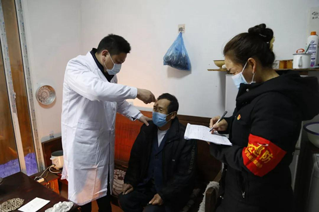 此時(shí),在社區(qū)74歲的戴坤倫老人家中,志愿者準(zhǔn)時(shí)上門宣傳疫情防控知識(shí),醫(yī)護(hù)人員為他測體溫,了解身體健康情況。面對(duì)大家的熱心關(guān)懷,戴坤倫熱淚盈眶,他說:“真是辛苦你們了,天天準(zhǔn)時(shí)上門為我測體溫,還給我提供口罩,我這道健康門就是靠你們守著的。臨走時(shí),志愿者反復(fù)叮囑老人不要出門、不要串門,也不要讓其他人來家串門。