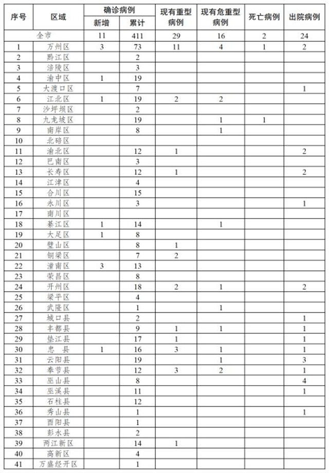 新增確診病例中,萬州區(qū)3例、渝中區(qū)1例、江北區(qū)1例、綦江區(qū)1例、大足區(qū)1例、潼南區(qū)3例、忠縣1例;新增重型病例中,忠縣1例、奉節(jié)縣1例;重型病例轉(zhuǎn)危重型病例中,萬州區(qū)2例、綦江區(qū)1例、云陽縣1例、奉節(jié)縣1例;新增出院病例中,大渡口區(qū)1例、渝北區(qū)2例、長壽區(qū)2例、開州區(qū)2例、城口縣1例、云陽縣1例。