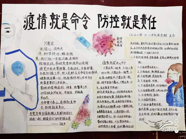 學(xué)校組織老師們通過班級QQ群、微信群等多種渠道,向?qū)W生和家長們宣傳有關(guān)“新冠肺炎”的各種知識以及預(yù)防和應(yīng)對措施。此外,學(xué)校還開展了“防控戰(zhàn)‘疫’我先行”的征文比賽和手抄報比賽,并委派學(xué)生們作為家庭預(yù)防戰(zhàn)線中的宣講員和守門員,主動承擔(dān)把守門關(guān)的重任,向家中的父母和老人發(fā)出預(yù)防倡議——“呆在家里就是對社會最大的貢獻(xiàn)”。