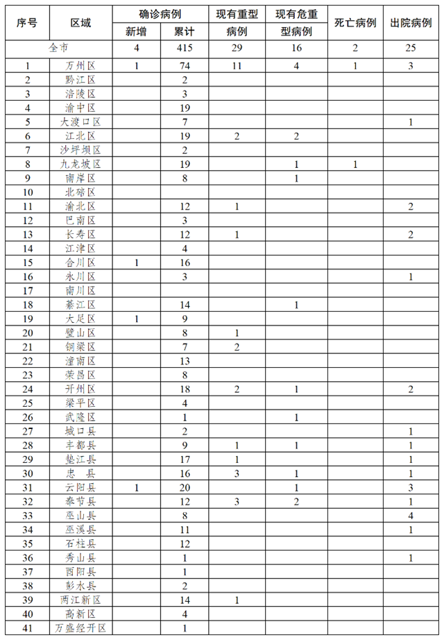 新增確診病例中,萬州區(qū)1例、合川區(qū)1例、大足區(qū)1例、云陽縣1例;新增出院病例為萬州區(qū)1例。