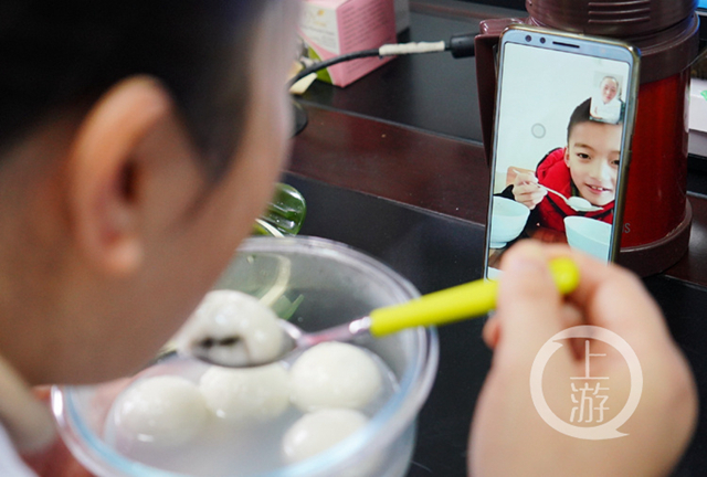 2月8日早上8點,張元群就端著湯圓和兒子開啟了視頻時間。