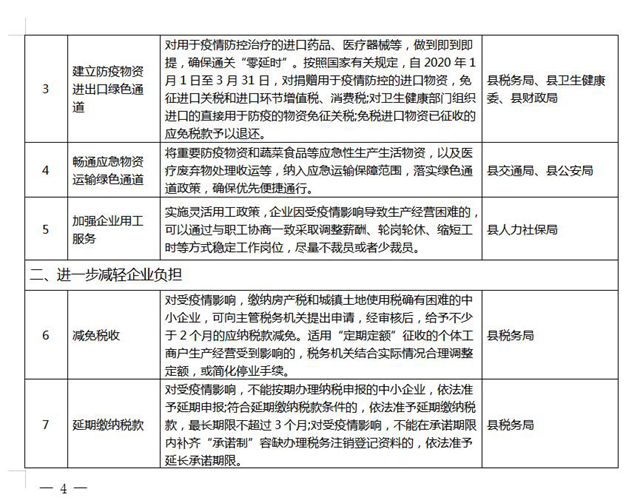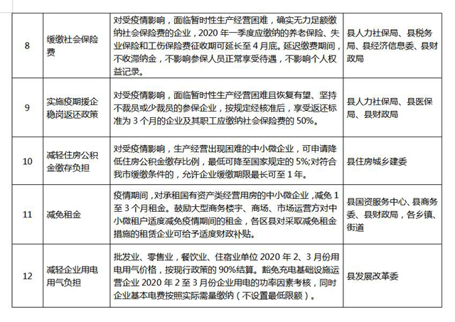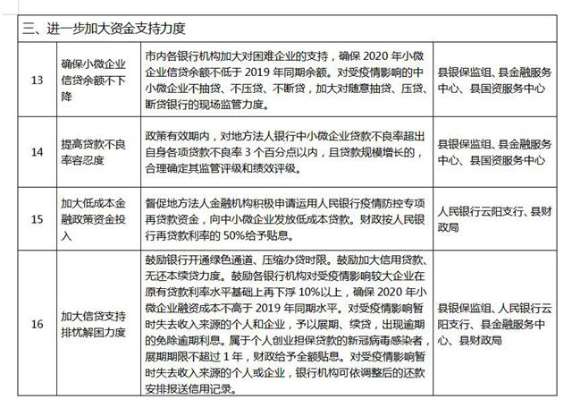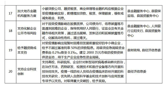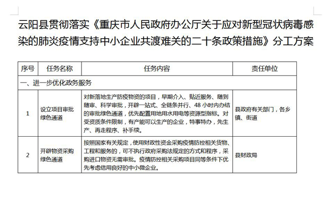《云陽縣貫徹落實〈重慶市人民政府辦公廳關于應對新型冠狀病毒感染的肺炎疫情支持中小企業(yè)共渡難關的二十條政策措施〉分工方案》,已經縣政府同意,現印發(fā)給你們。請各單位根據職能職責,主動對接市級部門,認真研究細化各項政策措施,切實抓好各項政策措施落地落實。