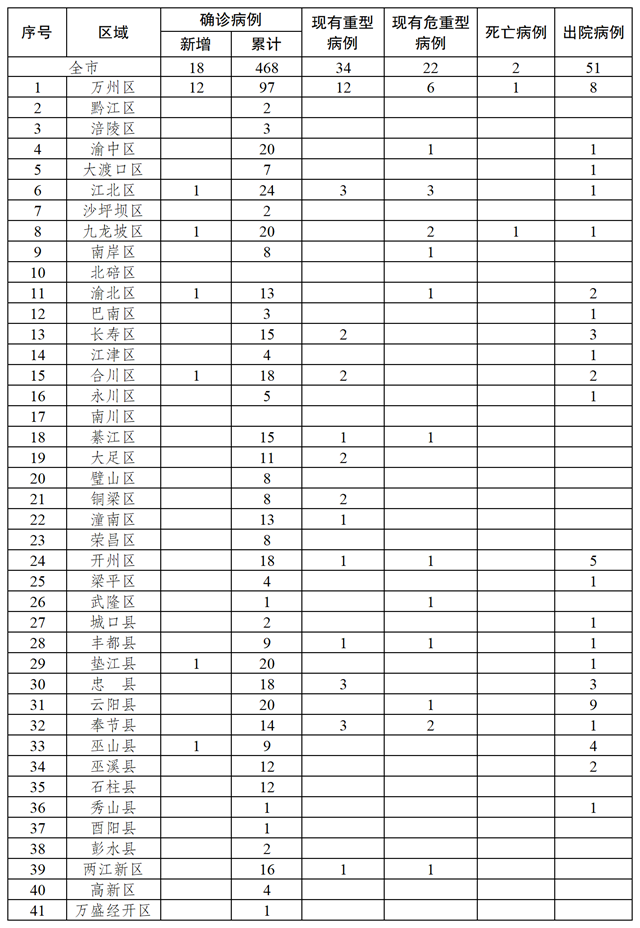 新增確診病例中,萬州區(qū)12例、江北區(qū)1例、九龍坡區(qū)1例、渝北區(qū)1例、合川區(qū)1例、墊江縣1例、巫山縣1例;新增重型病例中,萬州區(qū)1例、江北區(qū)1例、長壽區(qū)1例、合川區(qū)1例、大足區(qū)2例;重型病例轉(zhuǎn)危重型病例為萬州區(qū)1例;新增危重型病例為渝中區(qū)1例;新增出院病例中,萬州區(qū)3例、合川區(qū)1例、開州區(qū)3例、云陽縣2例、巫溪縣1例。