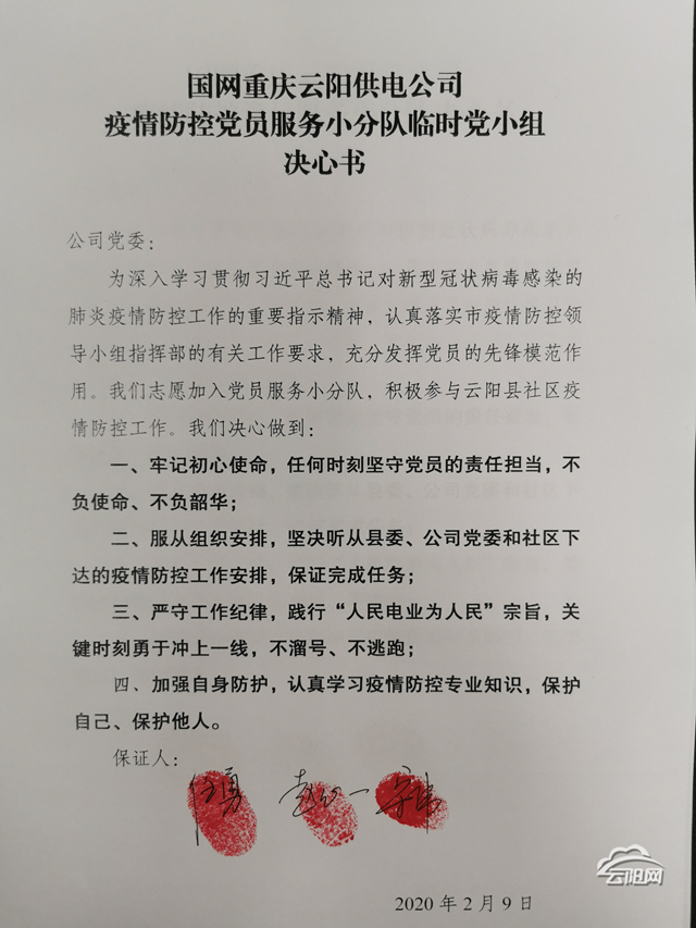 2月8日,在國(guó)網(wǎng)重慶云陽(yáng)供電公司黨員活動(dòng)室里,3名疫情防控黨員服務(wù)小分隊(duì)隊(duì)員在決心書(shū)上按下鮮紅的指印。