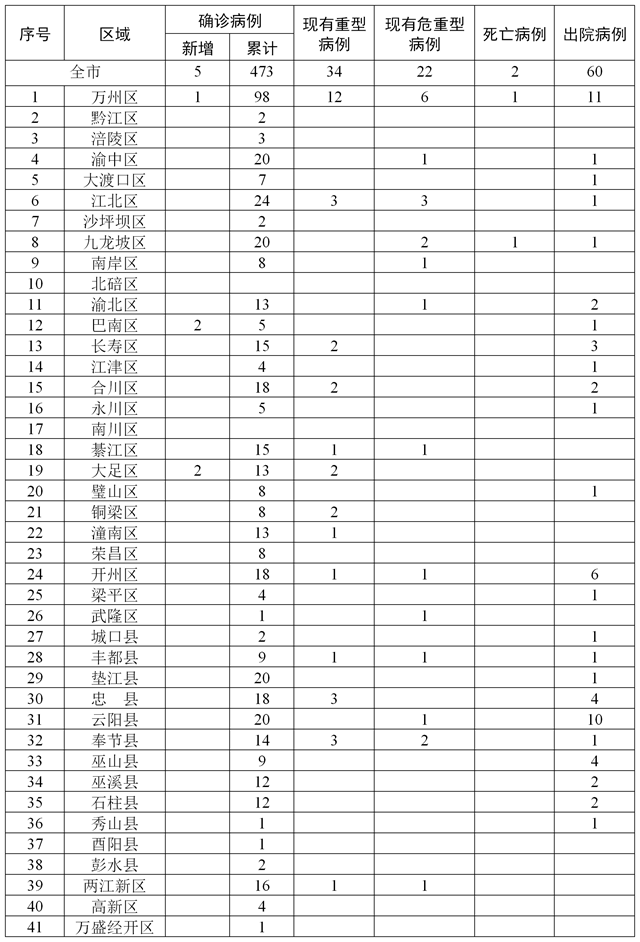 新增確診病例中,萬州區(qū)1例、巴南區(qū)2例、大足區(qū)2例;新增出院病例中,萬州區(qū)3例、璧山區(qū)1例、開州區(qū)1例、忠縣1例、云陽縣1例、石柱縣2例。