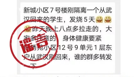 近日,有網(wǎng)友在微信群、朋友圈大量傳播消息稱:新城小區(qū)7號(hào)樓一武漢返家學(xué)生因新冠肺炎發(fā)燒5天被隔離,錦繡苑小區(qū)12號(hào)樓9單元也發(fā)現(xiàn)從武漢回來的住戶,請(qǐng)大家格外小心。