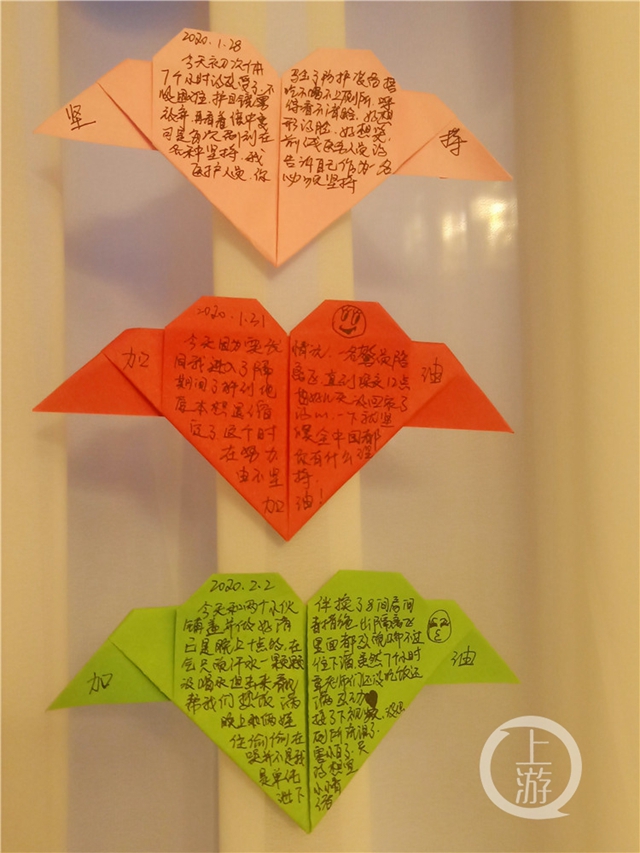 在兩江新區(qū)集中隔離醫(yī)學(xué)觀察點(diǎn)有一面特別的墻,上面整整齊齊地貼著愛(ài)心形狀的折紙。走近了你會(huì)發(fā)現(xiàn),這些折紙都是由醫(yī)護(hù)人員寫下的抗疫日記疊成的。