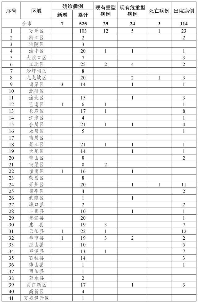 新增確診病例中,南岸區(qū)3例、巴南區(qū)1例、潼南區(qū)1例、云陽縣1例、奉節(jié)縣1例;新增出院病例中,萬州區(qū)7例、合川區(qū)1例、城口縣1例、云陽縣1例、巫山縣1例、巫溪縣1例。