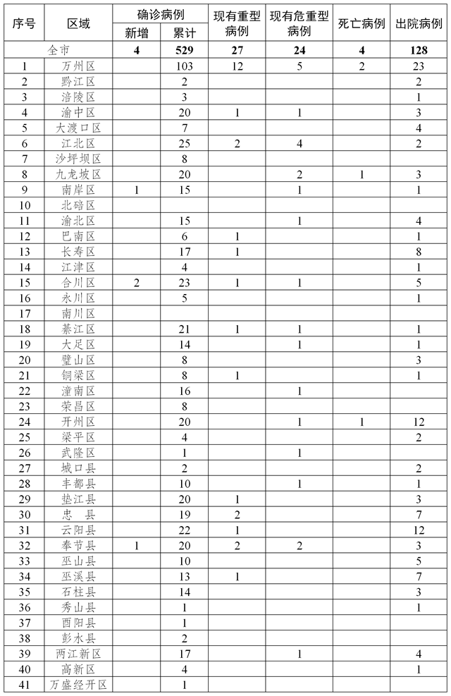 新增確診病例中,南岸區(qū)1例、合川區(qū)2例、奉節(jié)縣1例;新增死亡病例為萬州區(qū)1例;新增出院病例中,涪陵區(qū)1例、渝中區(qū)2例、大渡口區(qū)1例、渝北區(qū)1例、合川區(qū)1例、璧山區(qū)1例、銅梁區(qū)1例、開州區(qū)1例、墊江縣2例、奉節(jié)縣1例、兩江新區(qū)1例、高新區(qū)1例。