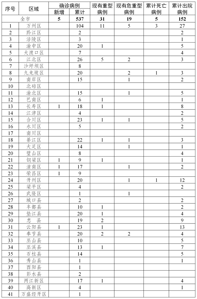截至2月14日24時,重慶市現(xiàn)有確診病例380例(其中重型病例31例、危重型病例19例),累計死亡病例5例,累計治愈出院病例152例,累計報告確診病例537例。累計追蹤到密切接觸者21158人,已解除醫(yī)學(xué)觀察15566人,尚有5592人正在接受醫(yī)學(xué)觀察。具體情況如下: