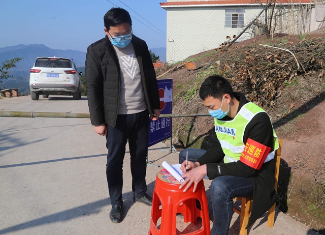 受領任務后,周永祥發(fā)揮軍人作風,迅速投入到疫情防控戰(zhàn)斗中。他緊跟村委會人員一道,戴上黨徽值守重點卡口?!澳愫?,請你停車搖下車窗,我是排查登記武漢和湖北返回人員和其他外來人員的”“無特殊情況大家請回到各自家中”“謝謝你的支持配合” ……十幾天來,周永祥堅守在防控疫情的崗位上,不斷重復著這些話,和大家一道參加24小時不間斷輪流值班值守。