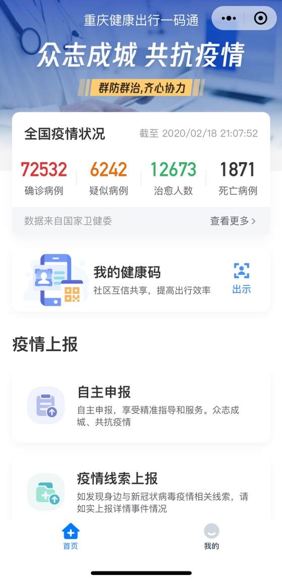 2月19日,“重慶健康出行一碼通”微信小程序正式上線。重慶市民可通過小程序獲得自主申報、疫情線索上報等服務。同時,市民可通過“自主申報”辦理專屬健康碼——“渝康碼”,并憑碼出行。