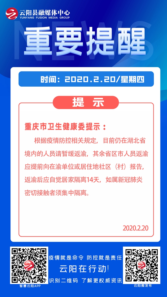 重慶市衛(wèi)生健康委提示:根據(jù)疫情防控相關(guān)規(guī)定,目前仍在湖北省境內(nèi)的人員請(qǐng)暫緩返渝,其余省區(qū)市人員返渝應(yīng)提前向在渝單位或居住地社區(qū)(村)報(bào)告,返渝后應(yīng)自覺(jué)居家隔離14天,如屬新冠肺炎密切接觸者須集中隔離。