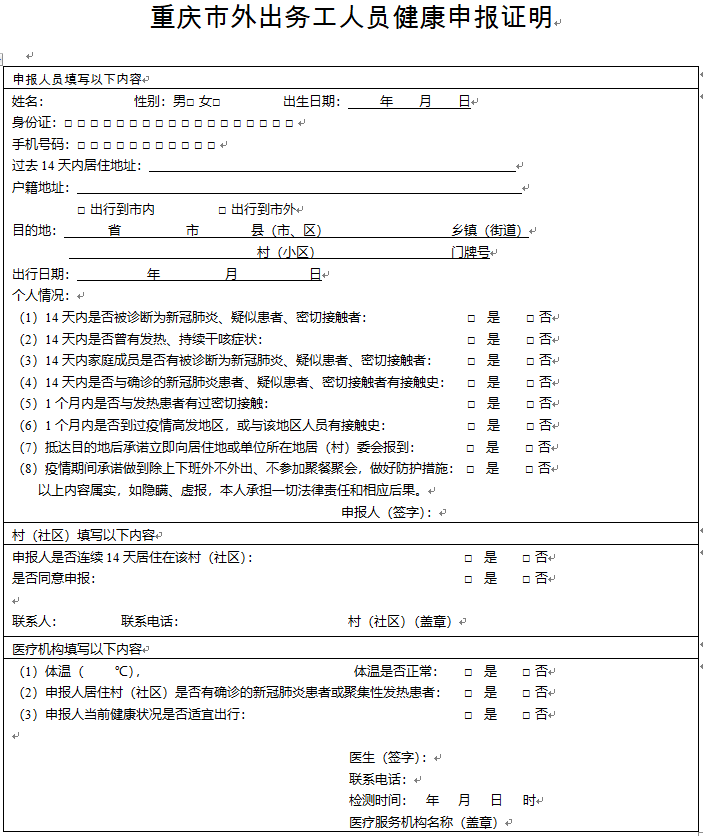 (二)服務內容。居住地醫(yī)療衛(wèi)生機構對有外出務工需要的申報人在開展流行病學史調查和測量體溫的基礎上,為符合條件的申報人員免費出具市衛(wèi)生健康委印制的《重慶市外出務工人員健康申報證明》(詳見附件,以下簡稱證明)。