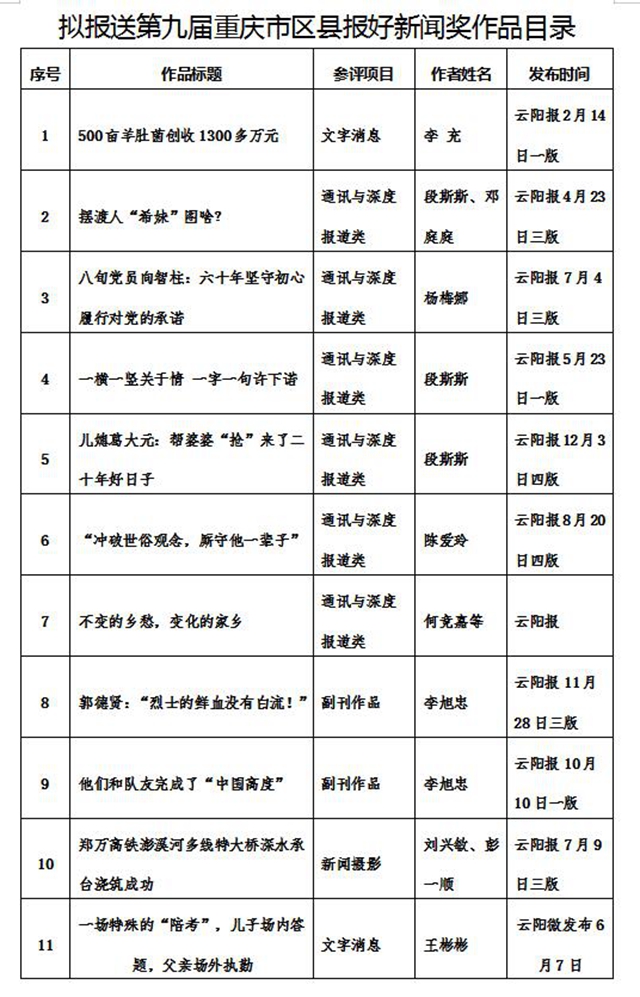 云陽報(bào)社組織的第九屆重慶市區(qū)縣報(bào)好新聞獎(jiǎng)初評(píng)工作于2020年2月20日結(jié)束,經(jīng)過云陽報(bào)社編委會(huì)評(píng)選,擬報(bào)送13件作品參加第九屆重慶市區(qū)縣報(bào)好新聞獎(jiǎng)的評(píng)選,并將參評(píng)作品在單位公示欄和云陽網(wǎng)上公示(網(wǎng)址:http://www.yyxw.net/),如有異議,請(qǐng)于2020年2月21日—2月27日實(shí)名向云陽報(bào)社辦公室反映。