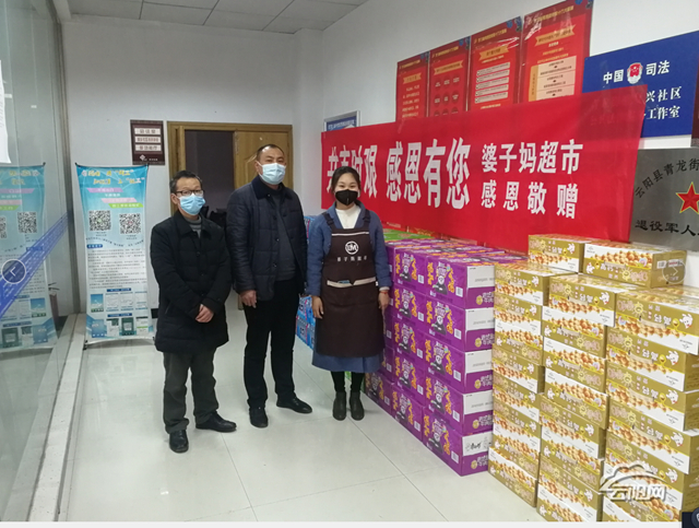 云陽(yáng)網(wǎng)訊(通訊員 譚福康)疫情無(wú)情,人有情。2月22日下午,青龍街道復(fù)興場(chǎng)鎮(zhèn)婆子?jì)尦信蓡T來(lái)到復(fù)興社區(qū)居委會(huì),為社區(qū)堅(jiān)守在疫情防控一線工作人員送去50件礦泉水、50件方便面、50件牛奶等總價(jià)值8000多元的慰問(wèn)品,助力該社區(qū)疫情防控工作。