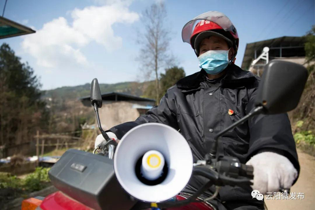 1月29日,云陽雙土鎮(zhèn)吉星村。盡管已是初春,陽光明媚,但受新冠肺炎疫情影響,大多數(shù)群眾都閑在家里,或在家門口沐浴著春日陽光。不過,這里卻有一個騎著摩托車的忙碌身影,穿行于村中大道小路。摩托車上綁著的一只小喇叭循環(huán)播放著疫情防控知識和勸誡之語:“今天不外出,是為了早日能出門;今天不串門,是為了明天能走動;今天不扎堆,是為了他日能團(tuán)聚;今天不聚餐,是為來日能暢飲……”