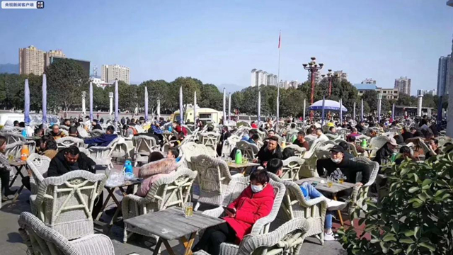 2月21日,四川廣元利州廣場,市民扎堆喝壩壩茶