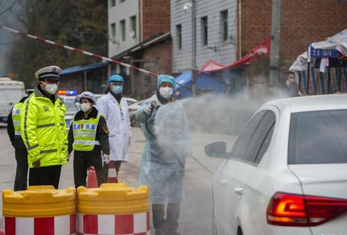▲2月14日,萬(wàn)州區(qū)龍駒鎮(zhèn),交警等部門組成的聯(lián)防聯(lián)控隊(duì)伍正在對(duì)來往車輛進(jìn)行消毒。記者 龍帆 攝
