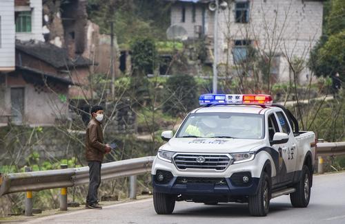 ▲2月14日,萬(wàn)州區(qū)龍駒鎮(zhèn),公安人員在萬(wàn)州與利川交界的蘇拉口卡點(diǎn)巡邏時(shí)對(duì)來往人員進(jìn)行勸導(dǎo)。記者 龍帆 攝
