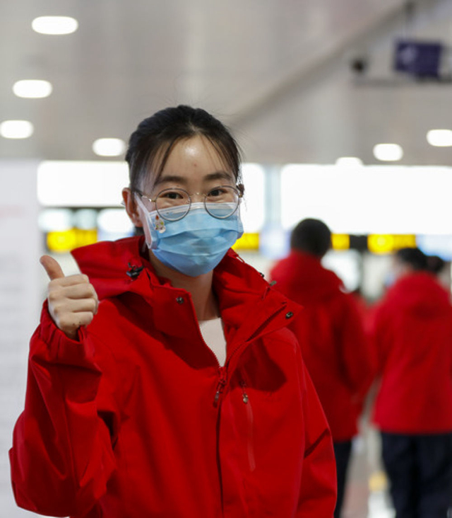 ↑2月20日,在重慶江北國際機場,重慶市第十三批支援湖北醫(yī)療隊隊員在出發(fā)前為自己加油。新華社發(fā)(黃偉 攝)