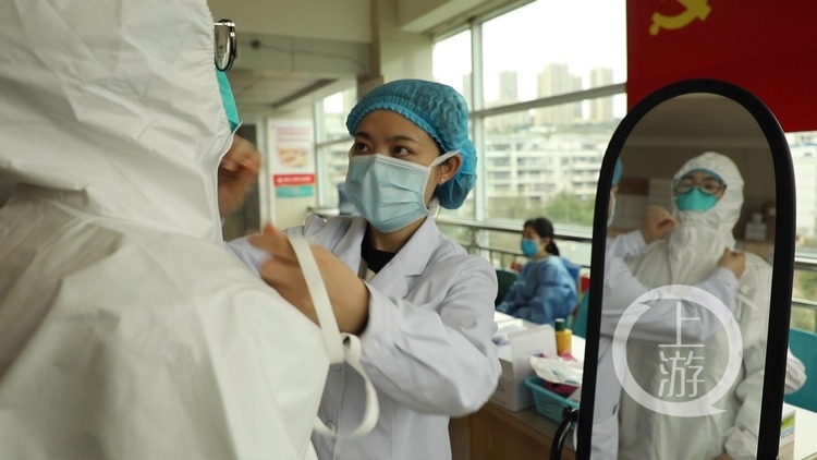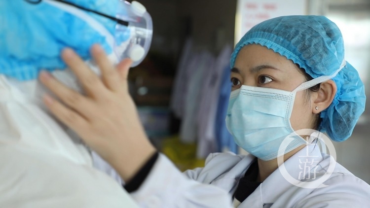 2月27日下午,黃霞出現(xiàn)在重癥肺炎應(yīng)急區(qū)的安全區(qū),忙著為“戰(zhàn)友”春花細心穿戴白衣“戰(zhàn)袍”,時不時地問一句:“會不會太緊?”