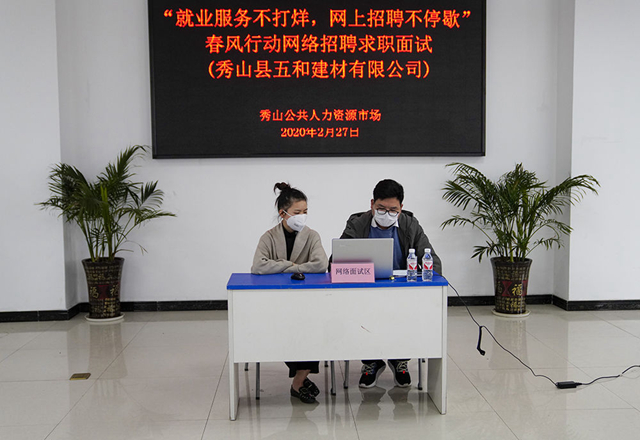 ↑2月27日,秀山公共人力資源市場內,一家招聘企業(yè)工作人員利用網(wǎng)絡面試求職者。新華社記者 劉潺 攝